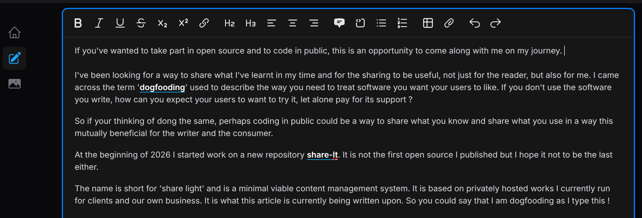 The project is in alpha and has no version tag yet but as of its changelog for 6th January 2026 it has sufficient to write articles. I will add more as time goes on. Next will be an API that static website builders can use to publish share-lt content. This I hope to be in similar fashion to other, much bigger apps and services in the 'headless CMS' space but with a fraction of the complexity and cost.