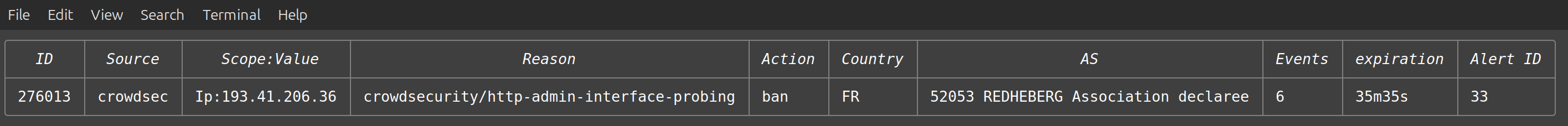 This shows that Crowdsec is currently configured to block access from an address in France. As this is a test system configured only a day or so ago I am mildly surprised but not shocked to see this. Production systems will generate many more alerts than this !