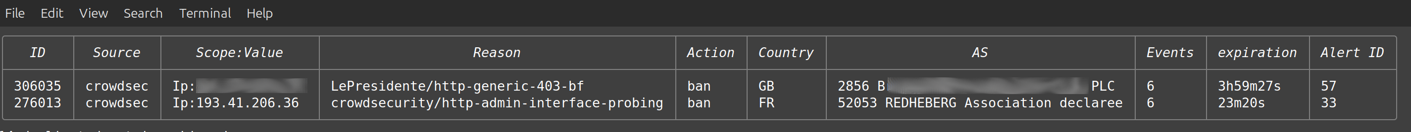 This shows that Crowdsec is currently configured to block access from an address in France. As this is a test system configured only a day or so ago I am mildly surprised but not shocked to see this. Production systems will generate many more alerts than this !